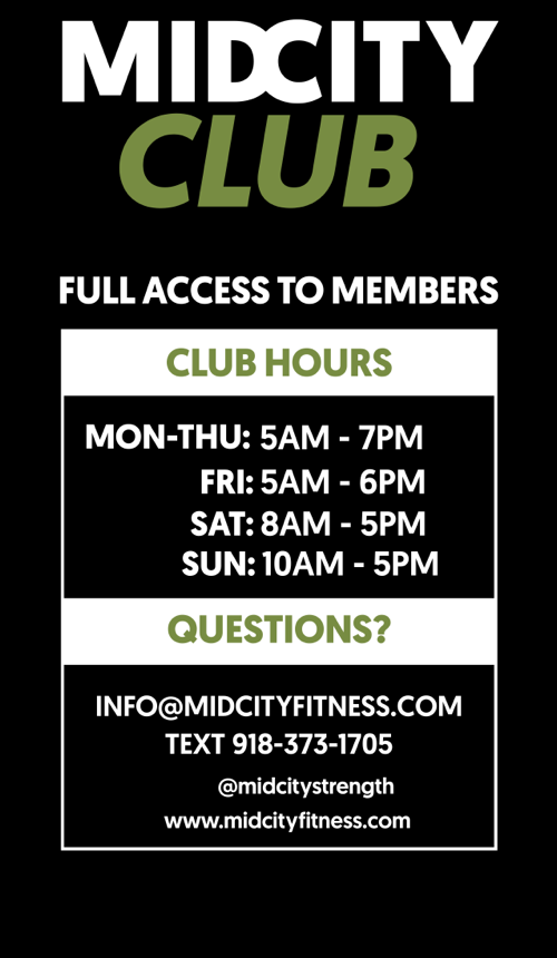 Text Scott at (918) 373-1705 scott@midcityfitness.com